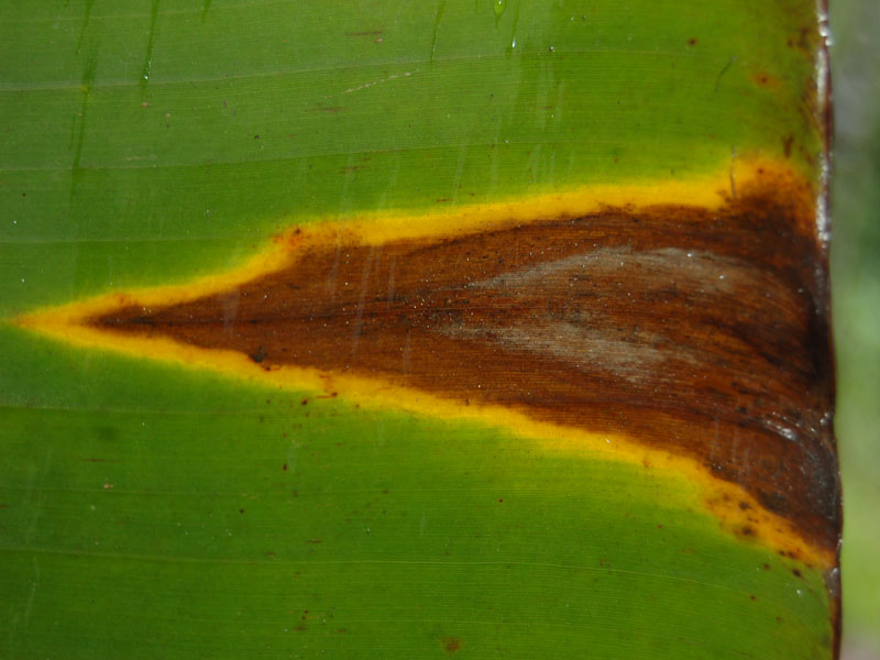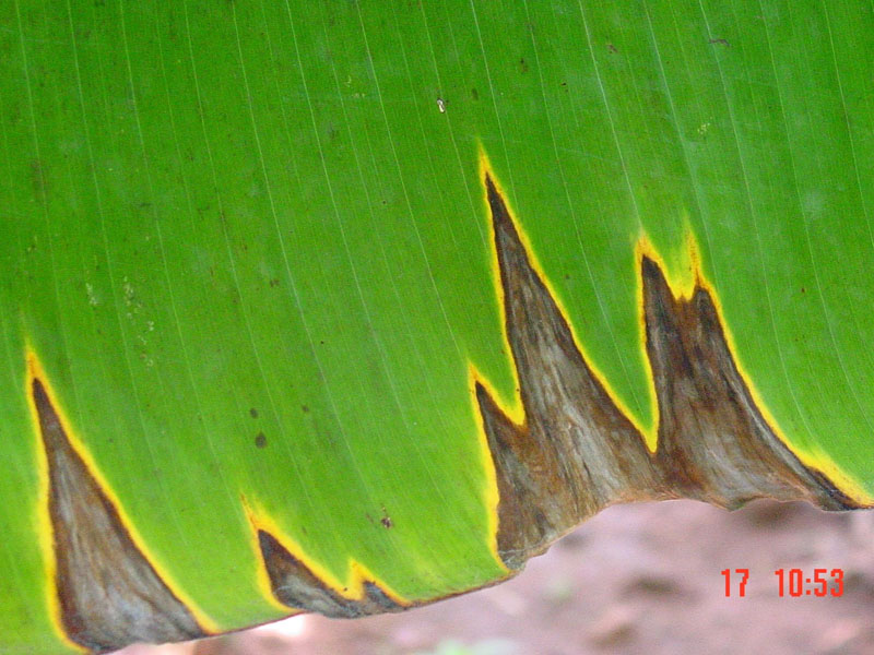 - The large spots dry in the centre with pale brown areas extending to the edge of the leaf blade giving the spots an inverted V shaped appearance.(Image3)