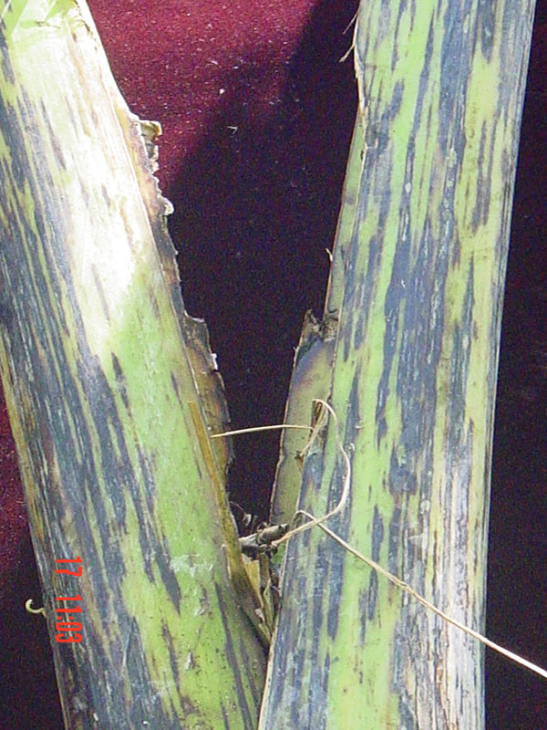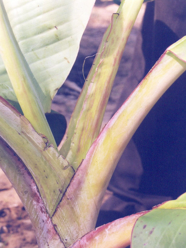 - New suckers from diseased plants show necrotic streaks or abnormal colour on the pseudostem