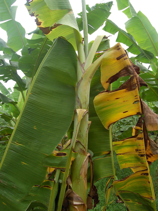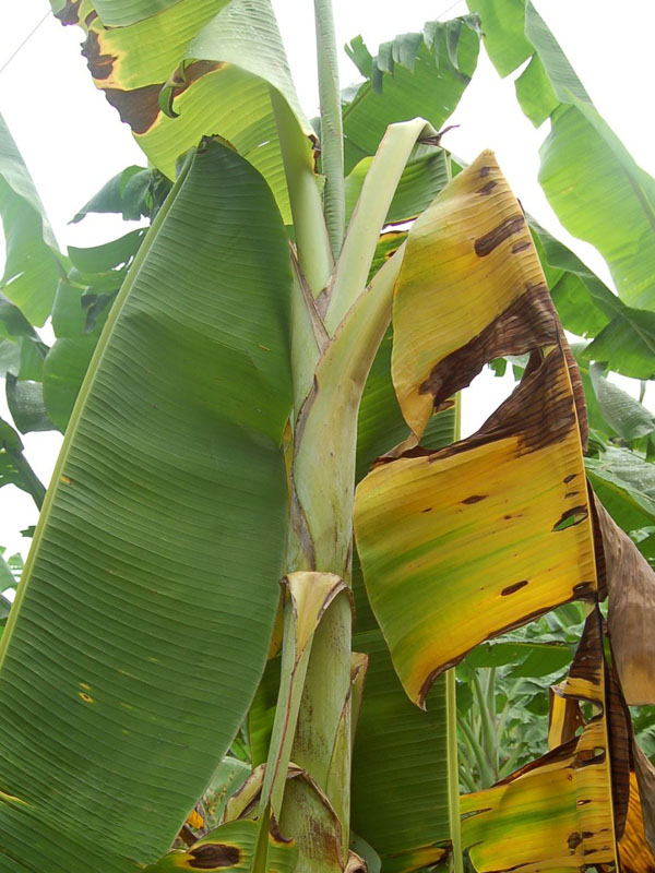 - In Cavendish varieties, the lower leaves develop a yellowish tinge which quickly spreads all over the leaves. Leaves acquire a tingy whitish-yellow appearance, become dry, flaccid and readily droop around the pseudostem