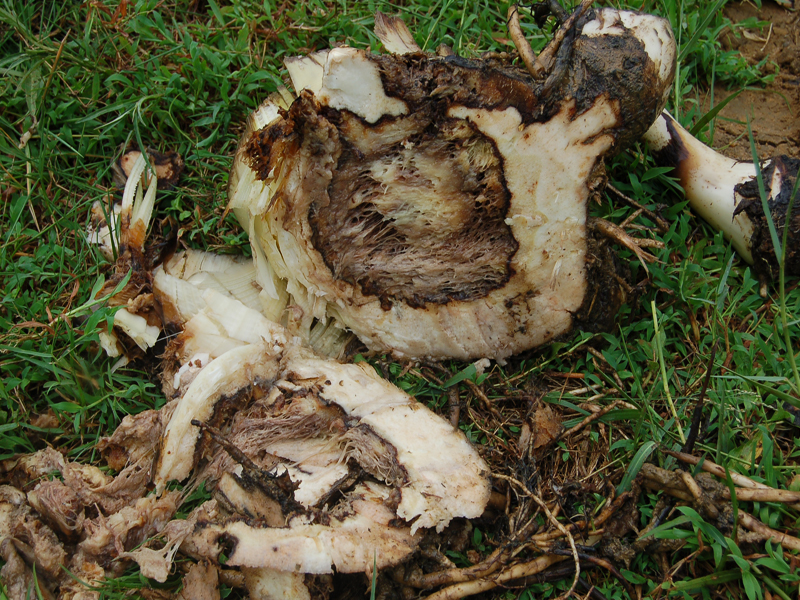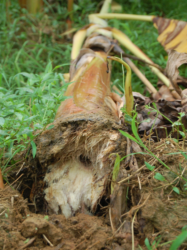 - The pseudostem tips over, breaking across the rotted portion, particularly at the ground level.(Image5).