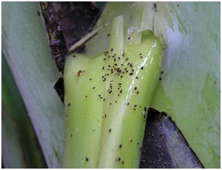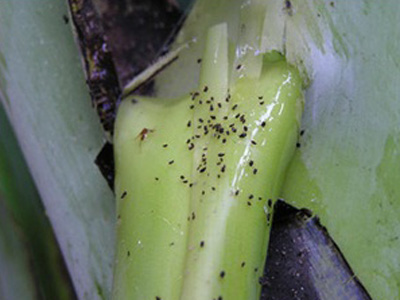 Aphids feed by sucking. They secrete honey dew which serves as the medium for sooty mould growth. While feeding, the aphids acquire bunchy top virus in a non persistant manner. The importance of this pest is not as a direct pest of banana but as a vector of virus diseases of banana.