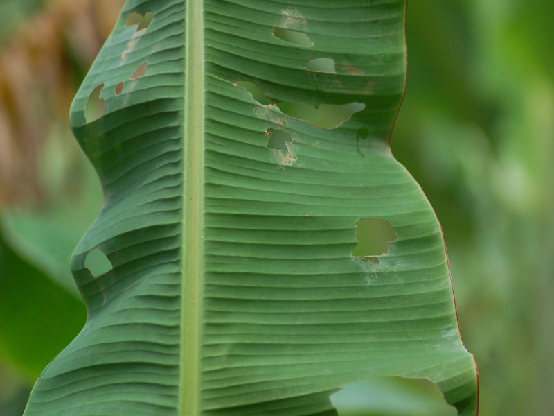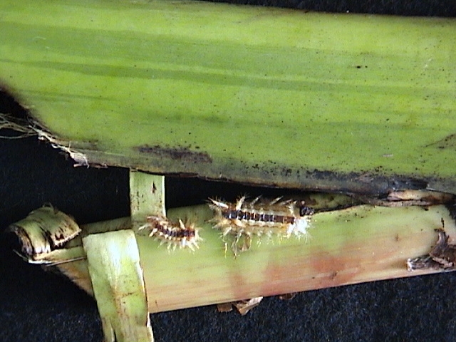 Symptoms The caterpillars are creamy white and have stout bristle like hairs which produce strong allergic reactions on touch.(Image1. They feed on emerging leaves by staying at the leaf axils resulting in shapeless holes on the leaves.(Image2) Control Measures