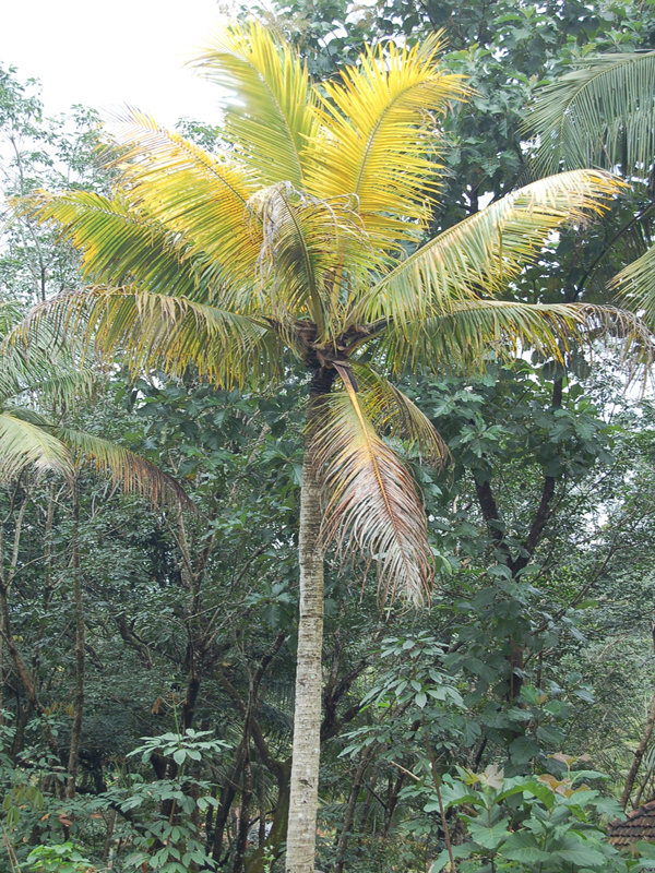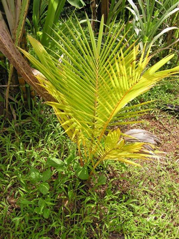 Symptoms General Yellowing of all leaves starting from lower mature leaves. Retarded growth and short leaves. Delayed fruiting and reduced nut yield. Abortion of inflorescence and low female flower count.