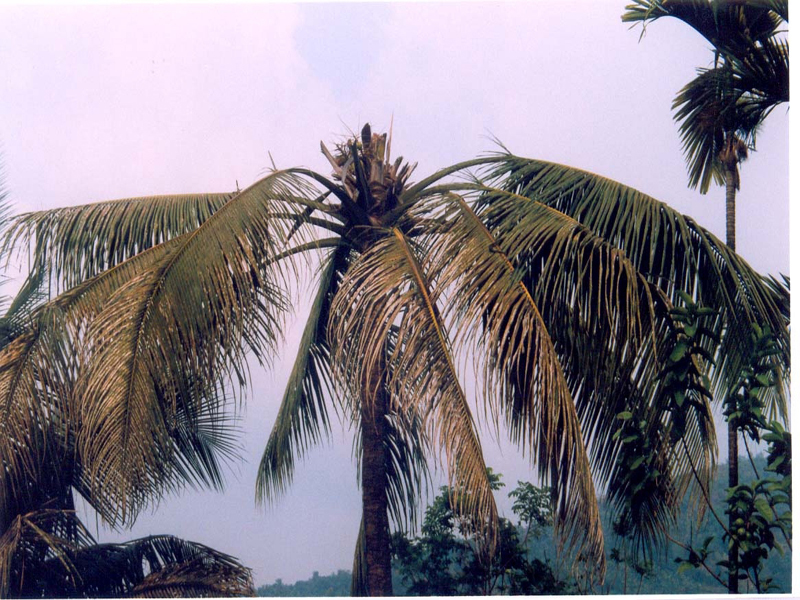 Disease development coincides with the prevalence of high humidity and low temperature. The young palms are more susceptible to this disease. The fungus survives in the disease affected crown tissues during summer months and multiplies during the ensuing season. The fungus has a wide host range like palmyrah, arecanut, oil palm, rubber, citrus, cocoa, black pepper, cardamom, bougainvillea, hibiscus, jack, etc. Heavy rainfall,high relative humidity of 94-100% and temperature below 240C are highly favourable for disease spread.