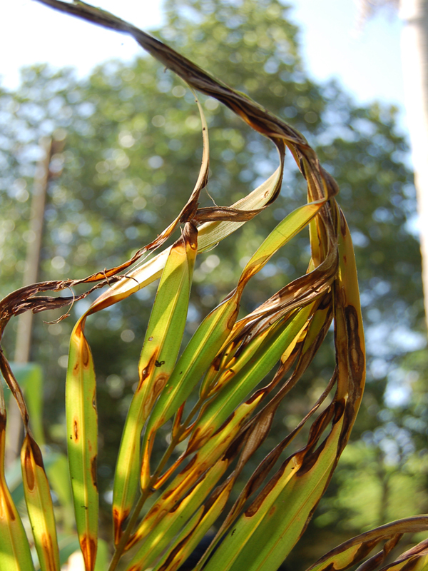 - The basal portion of leaflets may be devoid of symptoms, which gives a 'fan' shaped appearance when the leaf unfurls.