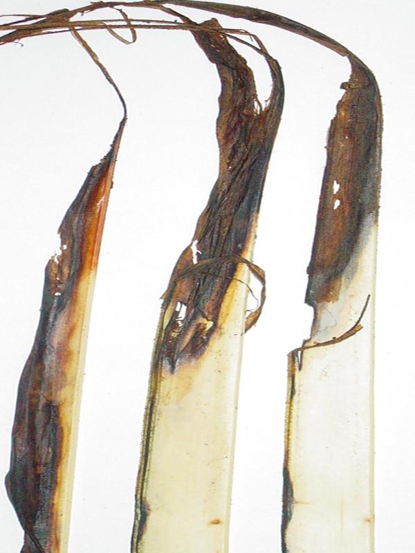 - The development of the symptoms and rotting is severe at the distal end of the leaf.