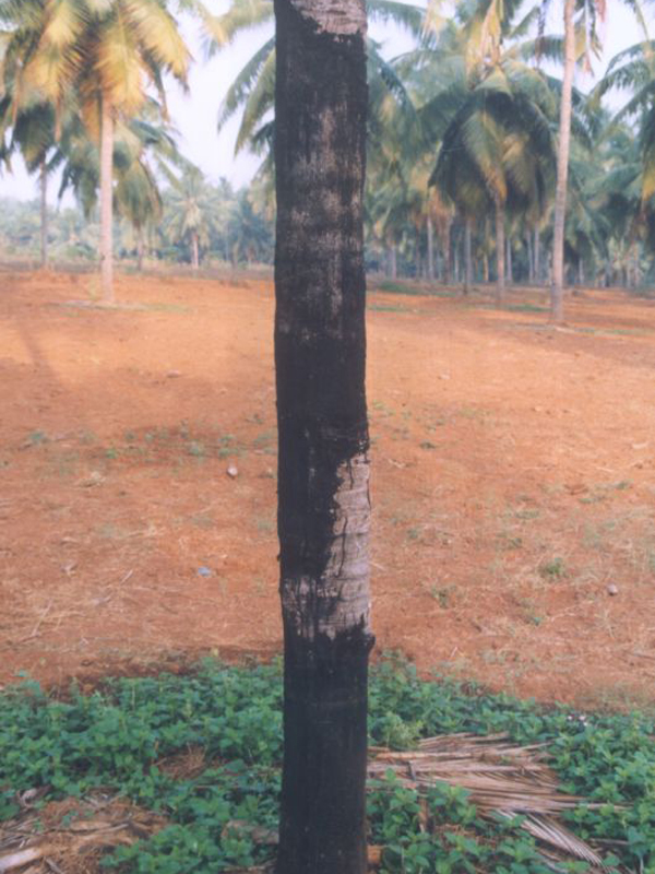 - The visible symptom is the presence of characteristic dark brown patches at the basal portion of the trunk.