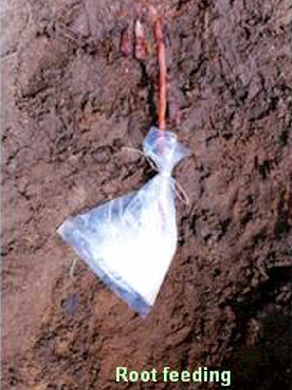 - Soil drenching with tridemorph @ 25ml in 25litres of water once in four months.