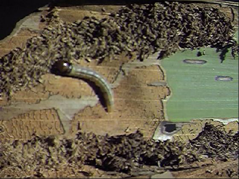 - The areas from which surface tissues have been eaten turn brownish and dry up.