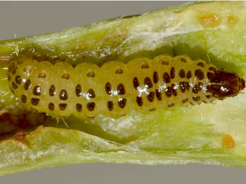 • The larva may also bore in to the tender stem. Infested flowers and pods may be webbed together.