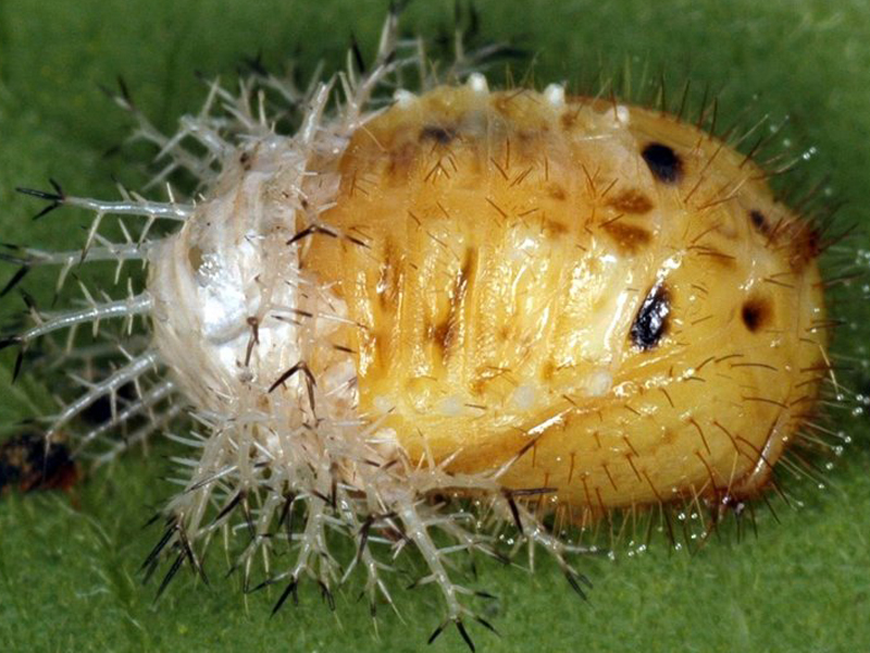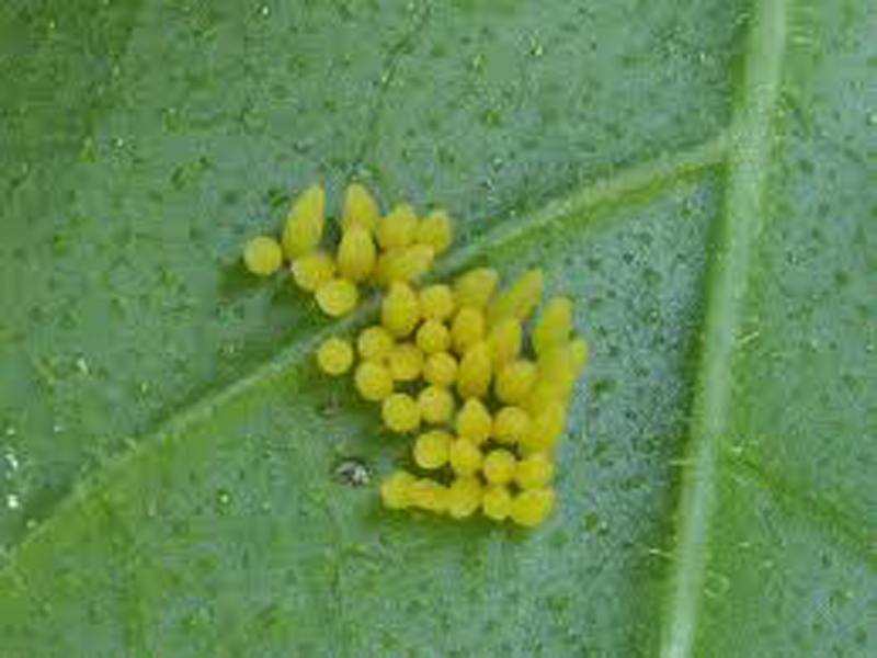 Select 5 pits at random from the plot. Assess the total number of grubs and pupae from 6 leaves from each pit (For this select 3rd to 8th leaves from the tip of a vine trailing on the pandal) and work out average per leaf. Less than 5 -Mild,5-10 Moderate >10 severe.