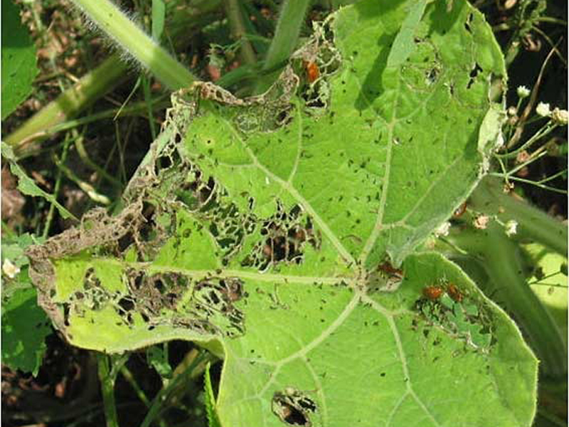 - The feeding holes seen on the leaves of cucurbitaceous vegetable is a characteristic symptom of damage by adult beetles.