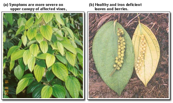 Interveinal chlorosis in younger leaves,youngest leaves becoming totally chlorotic.