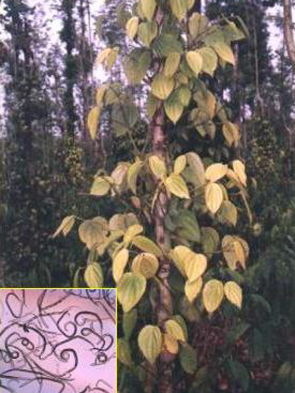 - The burrowing nematode cause necrotic lesions on white feeder roots resulting in yellowing of leaves which subsequently fall off.
