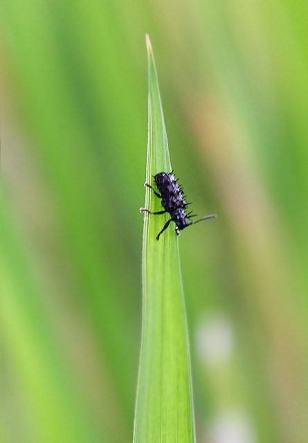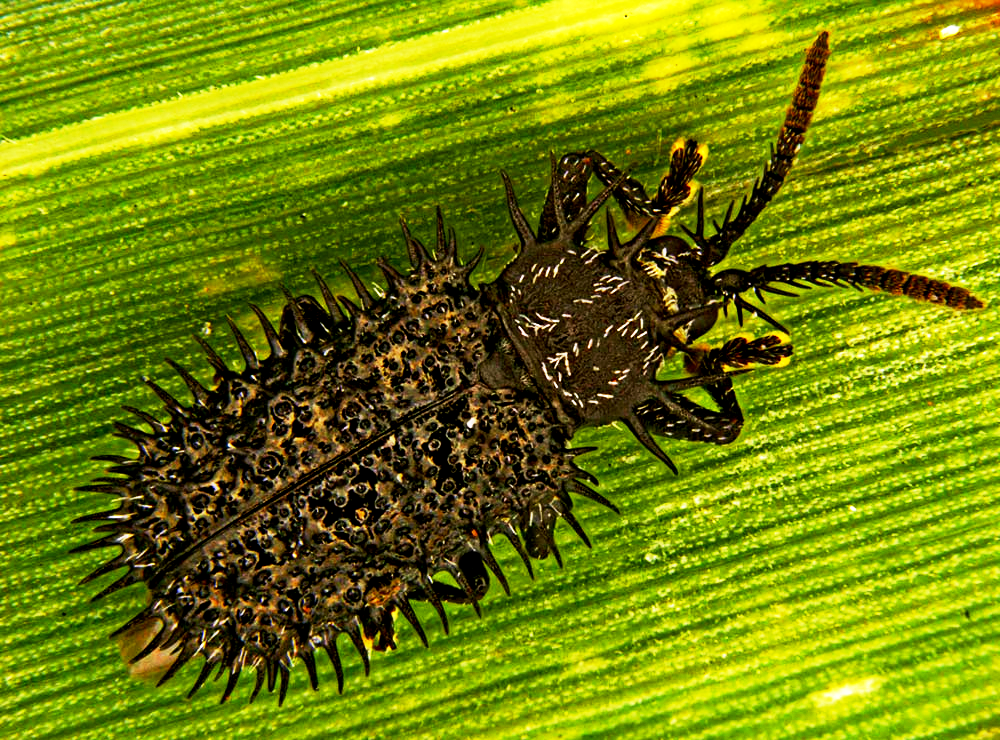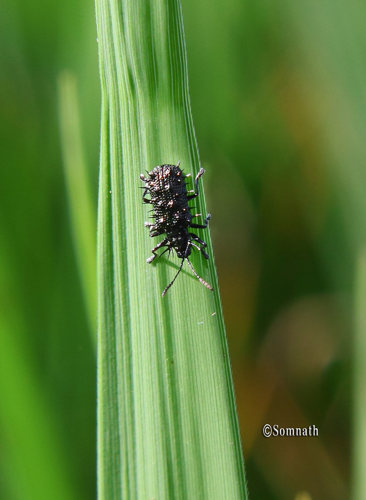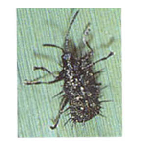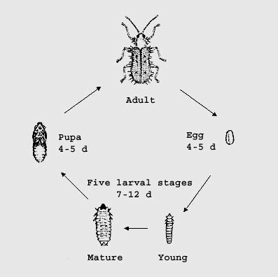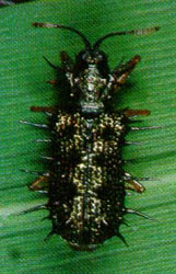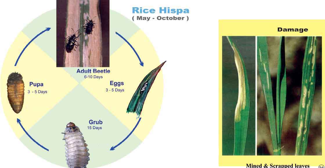 - The adult feeds on the green tissues of the leaves and feeding scars appears as short white lines on the leaf surface.