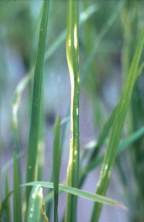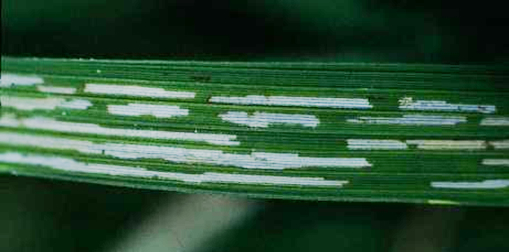 - Early stage of the crop is usually attacked. Infested areas are seen in patches and appear white in colour due to loss of chlorophyll.