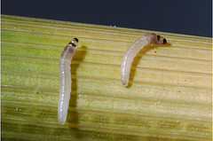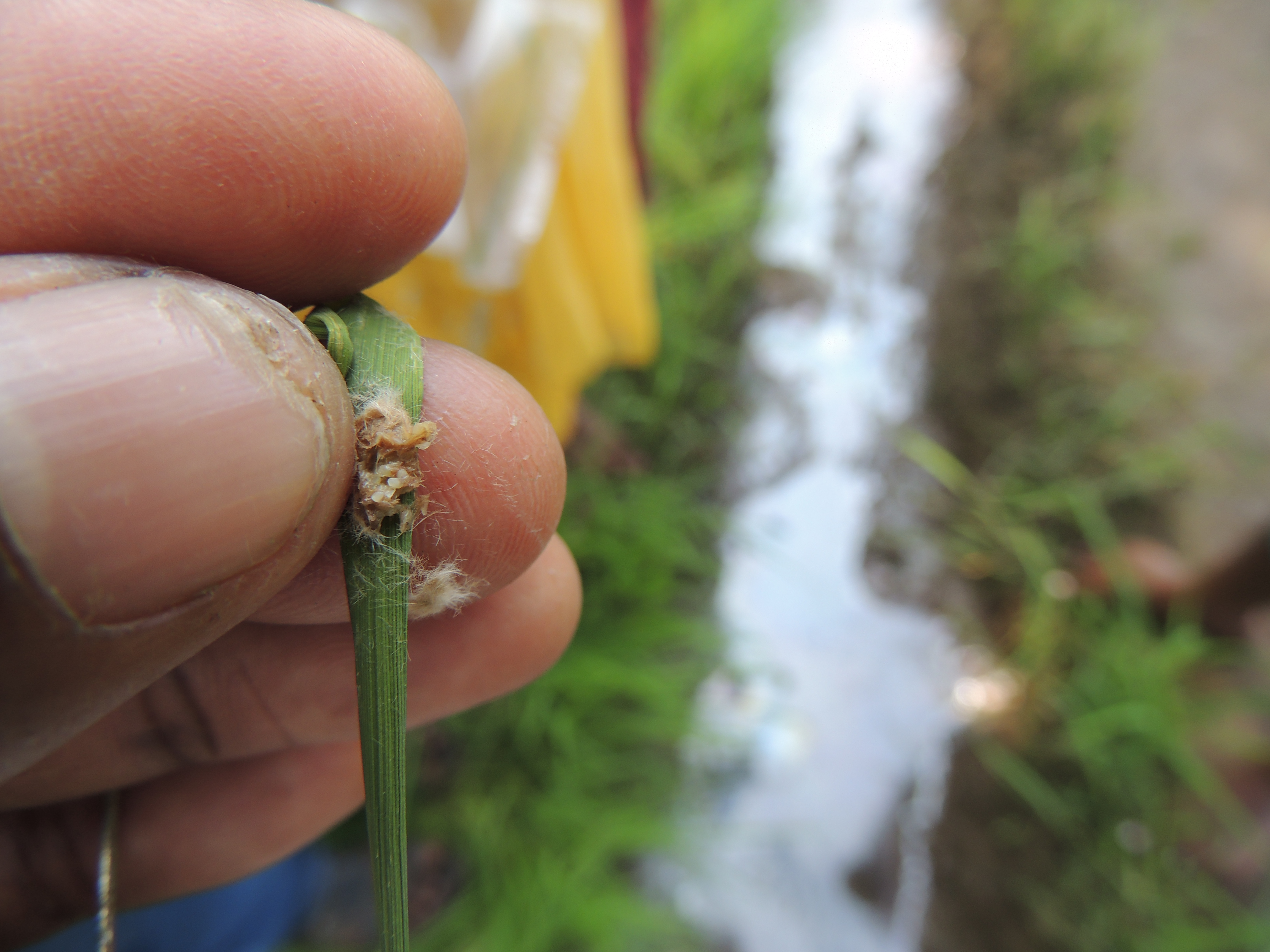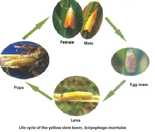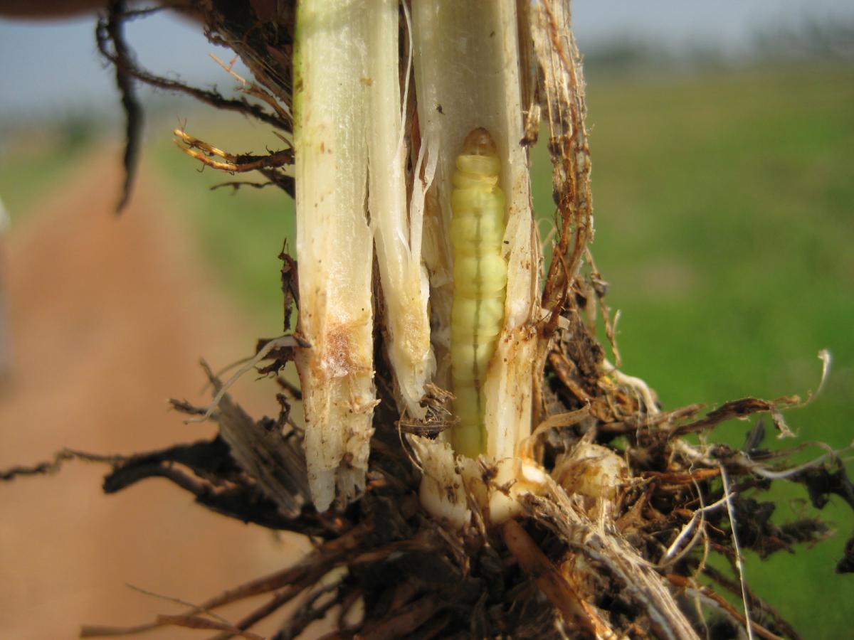 - All stages of the crop are infested by the insect.The caterpillar grows by feeding on the internal tissues of the stem. In the vegetative phase the central shoot dries off turning yellow in colour causing “dead heart”.